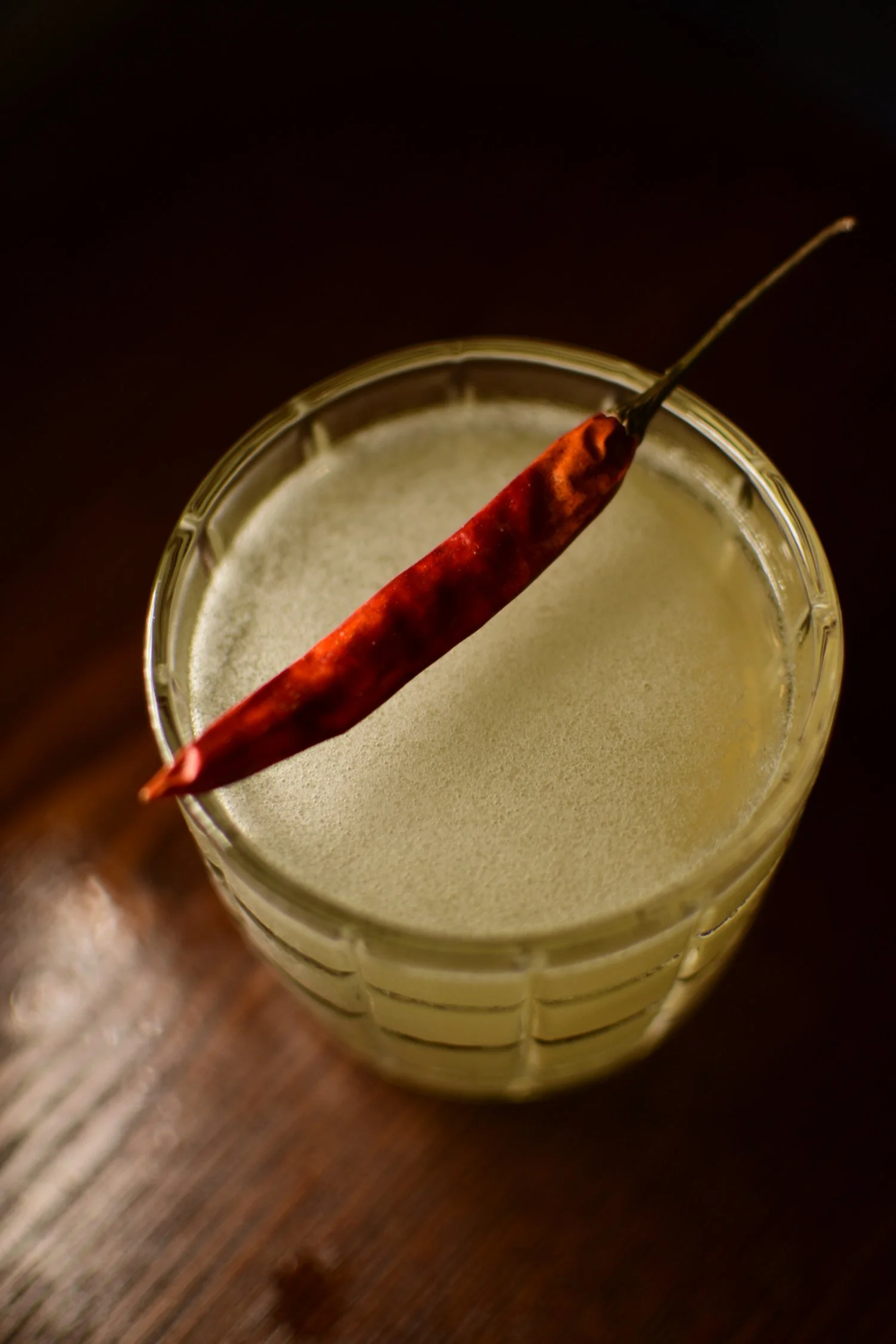 ➝ torched orange peel and maraschino cherry garnish (or chili pepper)